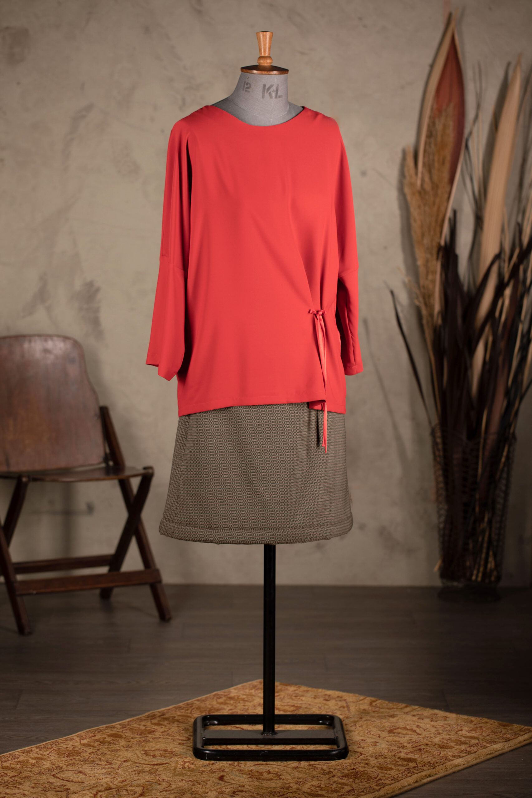 Μπλούζα μονόχρωμη από πολυέστερ και λεπτομέρειες από μετάξι και φούστα εβαζέ από εμπριμέ πολυεστερικό ύφασμα